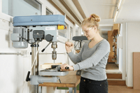 Korrektes Bohren eines Rundstabs mit Schutzbrille und Maschinenschraubstock